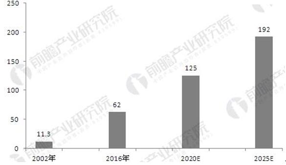 2002-2025年全球機器視覺市場規(guī)模及預測(單位:億美元)